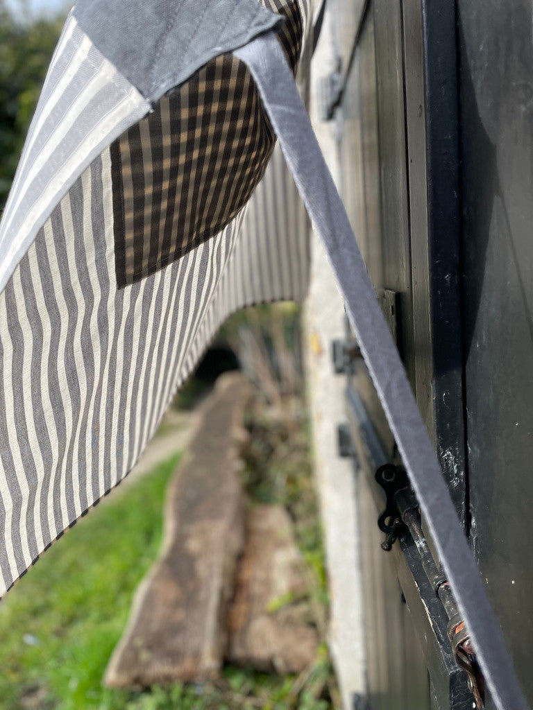 Adjustable cotton herringbone neck straps.